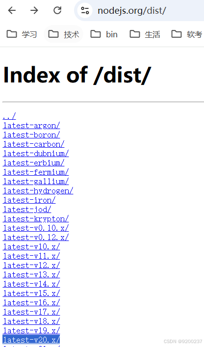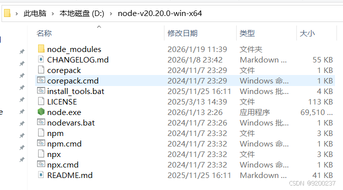 从以上链接中找一个自己想要的版本点进去,我选的latest-v20.x/ ,然后选的node-v20.20.0-win-x64.zip这个压缩包。