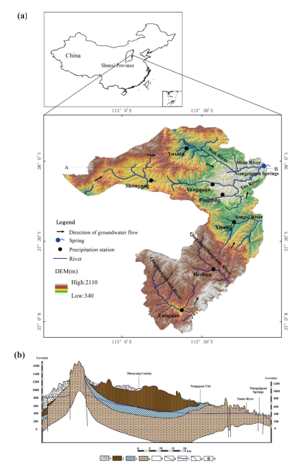 娘子关泉群(NS)是中国北方最大的喀斯特泉之一,位于太行山中东丘陵地带。NS流域典型的地貌特征是崎岖的丘陵,周围环绕着许多河流,谷地平缓,平均海拔在340至2110米之间。NS流域的西北和西南部海拔高于东部,整体地形向东倾斜。盆地东侧被北、西、南三座山丘环绕。流域面积为7394平方公里,包括于县、寿阳县、阳泉市、平定县、西阳县、合顺县和左泉县。北海峡的年平均流量为9.35米31959年至2019年年均降水量为534.6毫米。亚洲季风在七月、八月和九月贡献了约60%至70%的年降水量。降水是喀斯特含水层通过裂缝、裂缝和断层补给的主要来源。换言之,喀斯特含水层与上方第四纪含水层之间存在水力连接。含水层中,地下水的主要消耗是自然泉水排放和人工抽取。