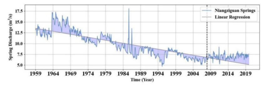弹簧放电通过线性回归分析。报告显示,1959年至2006年间春季流量呈明显下降趋势,自2007年以来下降趋势有所缓解,显示出相对稳定的春季流量。这是实施可持续发展政策的效果。具体来说,自2000年初以来,政府制定并完善了《泉水资源保护条例》,以建立明确的喀斯特地下水开发、利用和保护法律框架。这些法规包括指定关键泉水生态保护区,对应差异化管理策略,引入地下水提取许可制度,以及对工业用水征收额外费用。技术干预包括建立动态地下水监测网络,实时跟踪水位和水质。措施还重点推广节水农业实践、回收工业废水、关闭直接抽取喀斯特含水层地下水的抽水井,以及收取煤矿排水费用。这些策略旨在实现喀斯特含水层地区生态可持续性与社会经济发展之间的平衡。弹簧排放的变化清楚地展示了这些行政政策的有效性。因此,弹簧放电数据被分为两个阶段。第一阶段(1959年至2006年)中,泉水流量明显呈下降趋势,主要由地下水过度开采主导。第二阶段(2007年至2019年),泉水流量下降趋势得到缓解,显示出相对稳定的泉水流量。