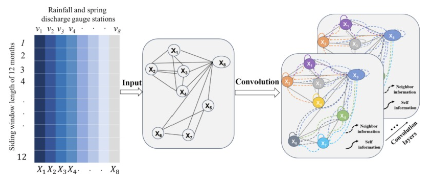 每个节点的信息聚合,包括它自身及其邻居,具体来说,输入数据是每个轨距站的滑动窗口12个月。这八个节点汇总了七个轨距站的降水和泉水排放。实线表示来自局部地区的降水流总量,虚线表示邻近地区的流量。