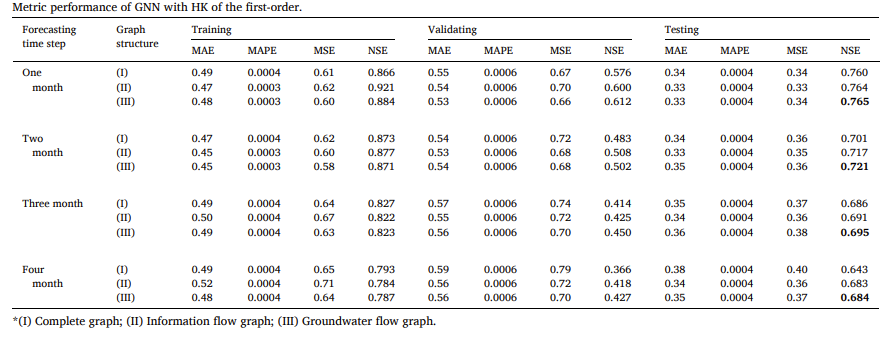 根据训练、验证和测试期间的度量表现(即 MAE、MAPE、MSE 和 NSE),我们确定预测模型中每个多时间步的最优图结构。三种图结构的度量表现显示,在训练、验证和测试期间均有令人满意的拟合效果。同时,显示训练和验证周期的度量性能随着预测时间步长的增加而下降。换句话说,预测时间步越长,性能越低。