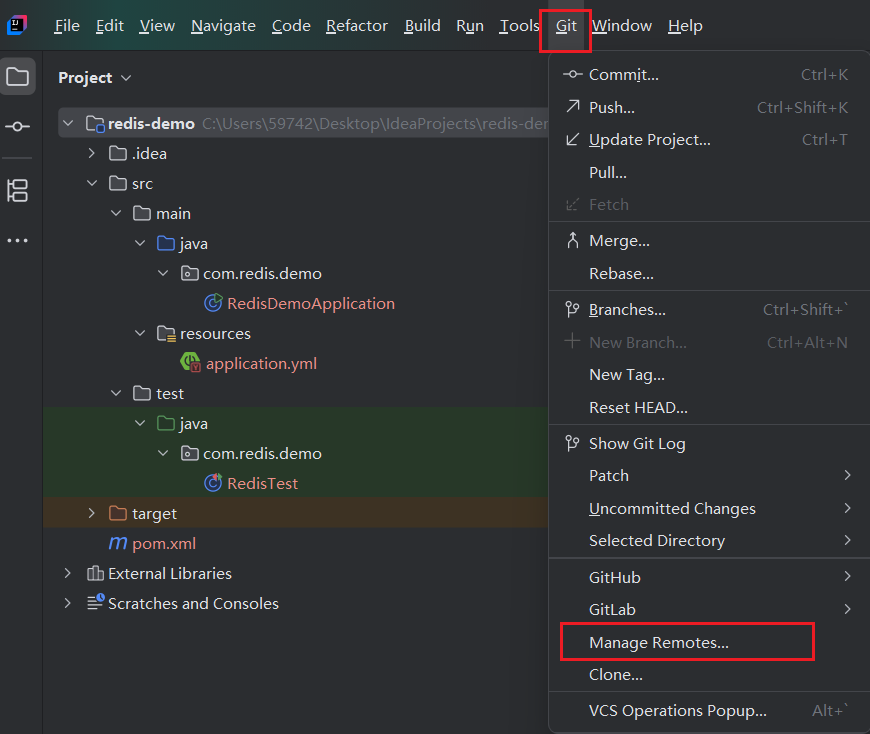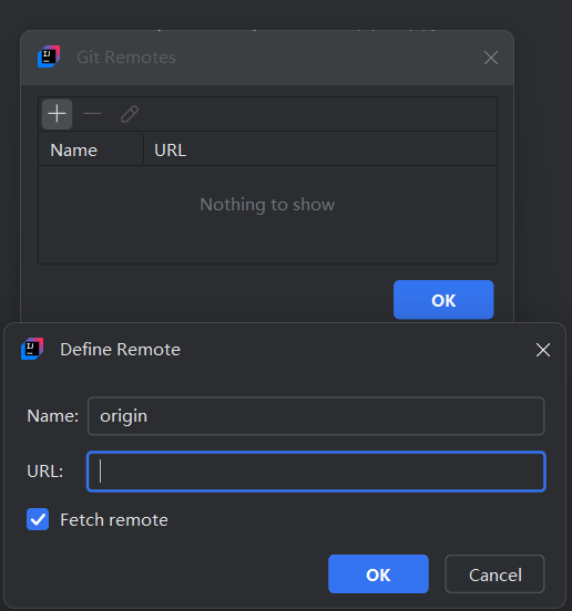 也可以在 IDEA 里操作:右键项目 → Git → Manage Remotes... → 点击 + 号,输入远程仓库的名称(一般叫 origin)和 URL。