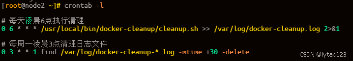 0 6 * * *:每天6:00执行>> /var/log/docker-cleanup.log 2>&1:将标准输出和错误输出都重定向到日志文件0 3 * * 1:每周一3:00执行-mtime +30:删除30天前的文件