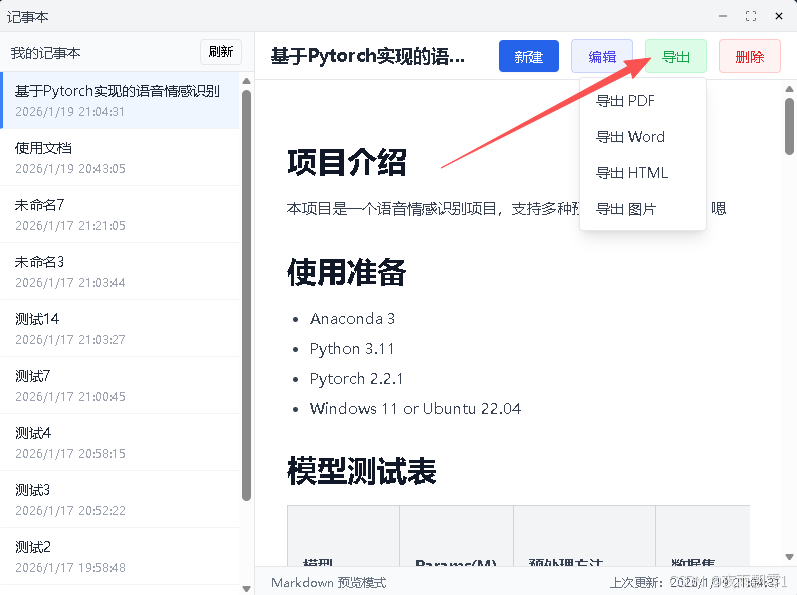 保存编写的文档后,在记事本的左边是编辑文档的记录,右边是文档预览内容。点击导出按钮,可以选择导出的文档格式,支持:PDF、Word、HTML、以及图片格式。