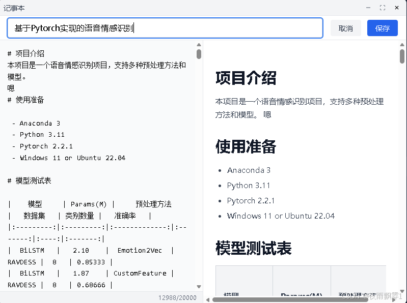 打开记事本后,点击新建即可开始编写文档,支持Markdown格式,在左边输出内容,右边实时预览结果。