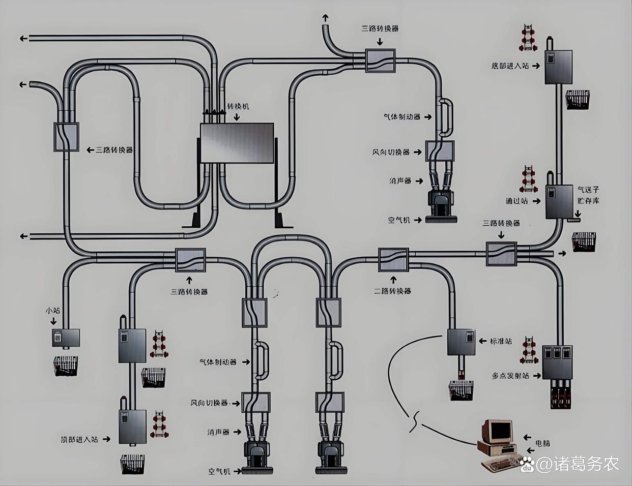 工作原理:系统由风机、正负压管网、导管、阀门(如两位三通阀)和连通管等构成动力单元。通过正压(推动)或负压(抽吸)使运输载体(如运输罐、活塞车)在管道内移动。