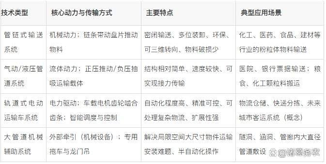 广义管网运送机械系统的技术实现方式多样,主要可分为以下几类: