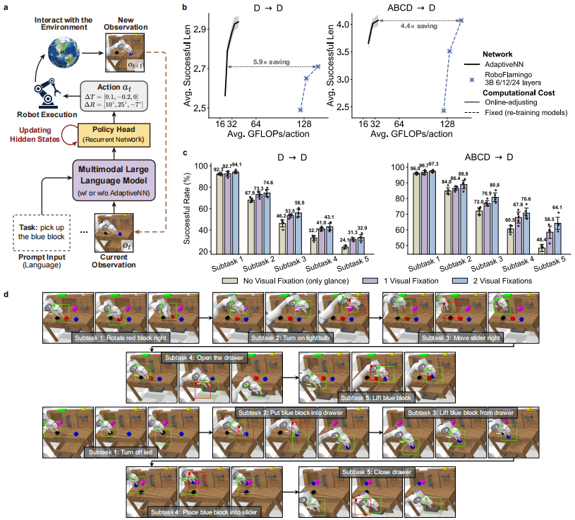 将 AdaptiveNN 作为感知模块嵌入到多模态大语言模型中,构建具身AI智能体。在 CALVIN 机器人操作基准测试中,基于 AdaptiveNN 的模型在保持性能的同时,将计算成本降低了 4.4-5.9倍,并能根据语言指令和视觉环境,动态决定"看哪里"。