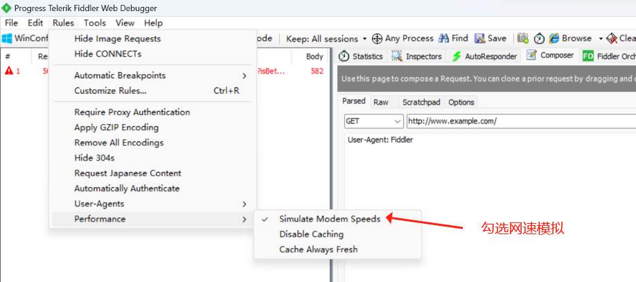 配置请求和响应延迟后保存配置,然后在继续勾选Rules → Performances → Simulate Modem Speeds 这个配置;