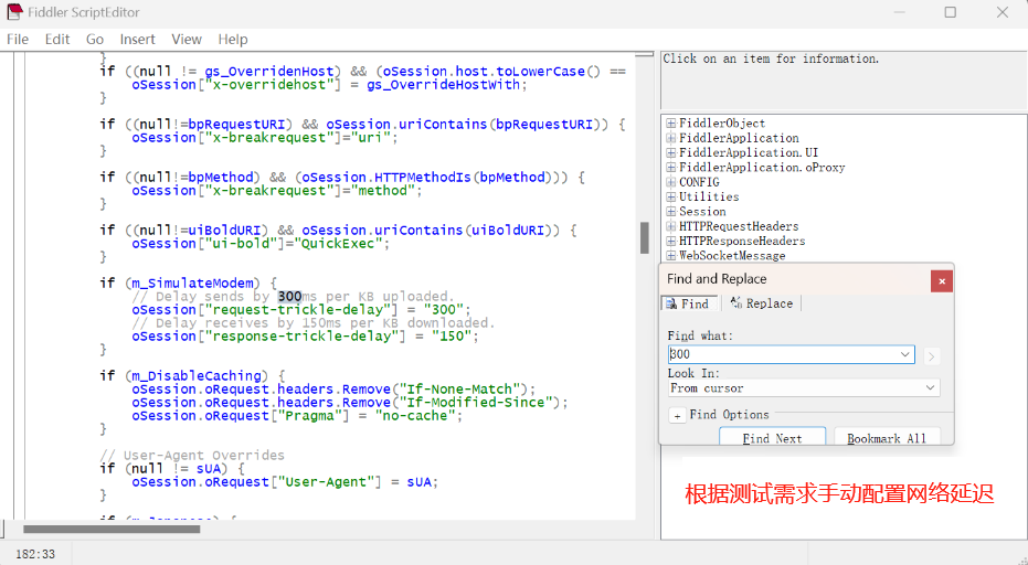 打开网速模拟模式开关(Rules → Performances → Simulate Modem Speeds ),使用的是Fiddler系统的默认限速;如延迟300ms
