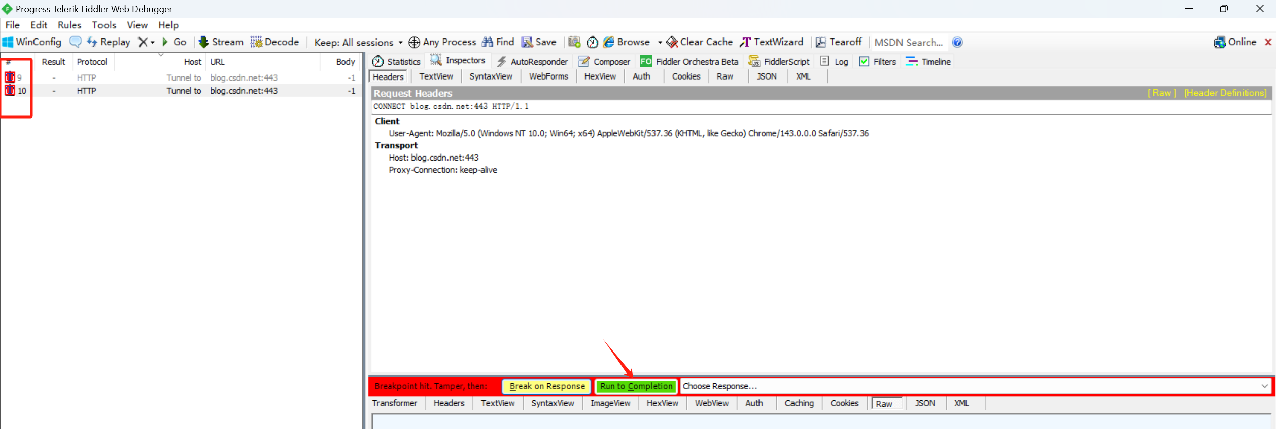 - 设置路径:如1、设置【Before Requests】,2、提交请求,Fiddler都会在请求前断点,3、此时可以修改请求数据,修改后;4、点击绿色的【Run to Completion】后可以返回响应数据