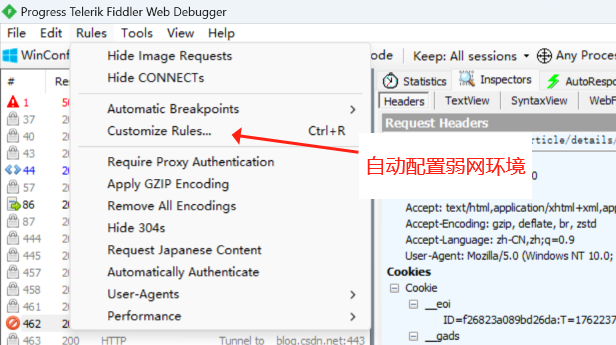可手动设置网络延迟,进行弱网设置,如配置路径(Rules → Customize Rules)
