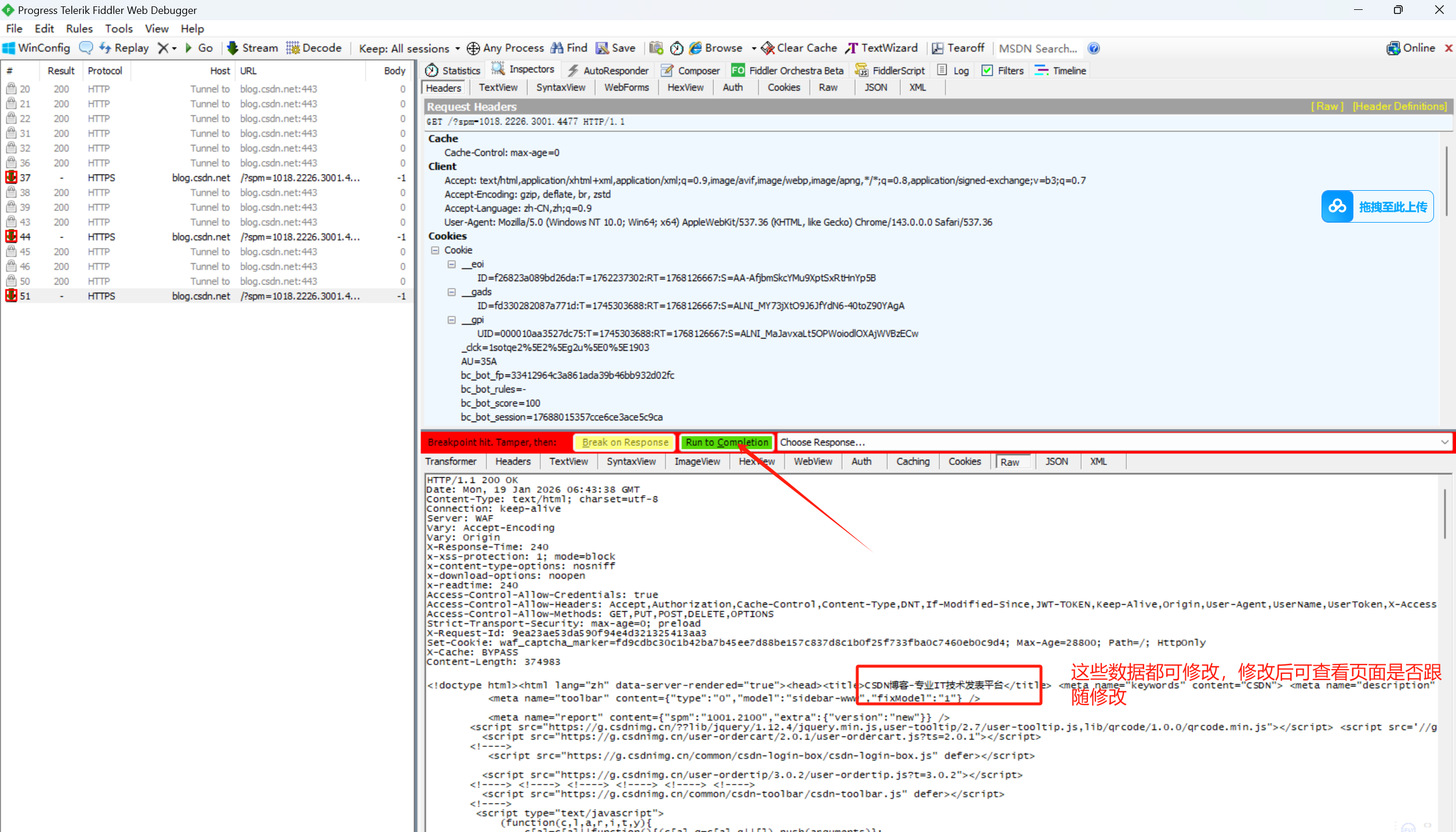 - 操作步骤:如1、设置【After Responses】后,2、提交请求,Fiddler都会在请求后断点,3、此时可以修改响应数据,修改后;4、点击绿色的【Run to Completion】后网页页面数据跟随修改。