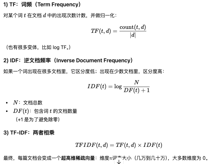 TF-IDF 是一种把文本变成"向量"的经典方法,全名 Term Frequency--Inverse Document Frequency(词频-逆文档频率)。它的核心思想很朴素: