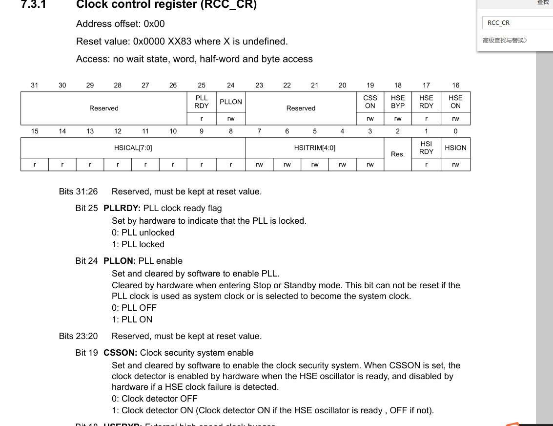 再回到HAL代码中,通过RCC->xxx寄存器来读写访问这些寄存器,如果RCC->xxx寄存器作为赋值运算符的左值,那么会进行写操作,如果RCC->xxx寄存器作为右值则进行读操作。可以将c语言中"->"使用"_"替代,再参考手册中查询得到对应寄存的值。例如:搜索RCC_CR可以搜索找到CR寄存器。