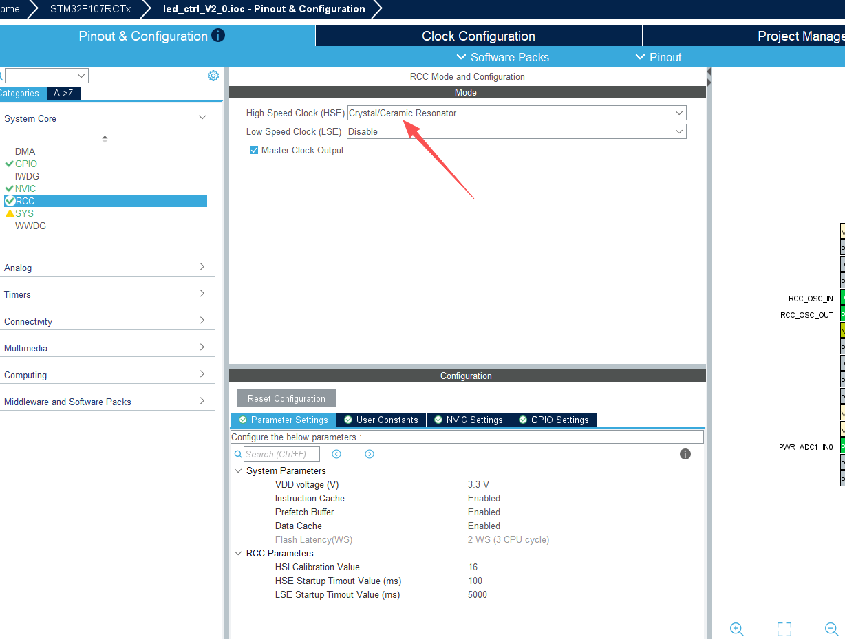 首先如果使用的是外部无源晶振,那么RCC的High Speed Clock(HSE)需要选择:Crystal/Ceramic Resonator这个选项。