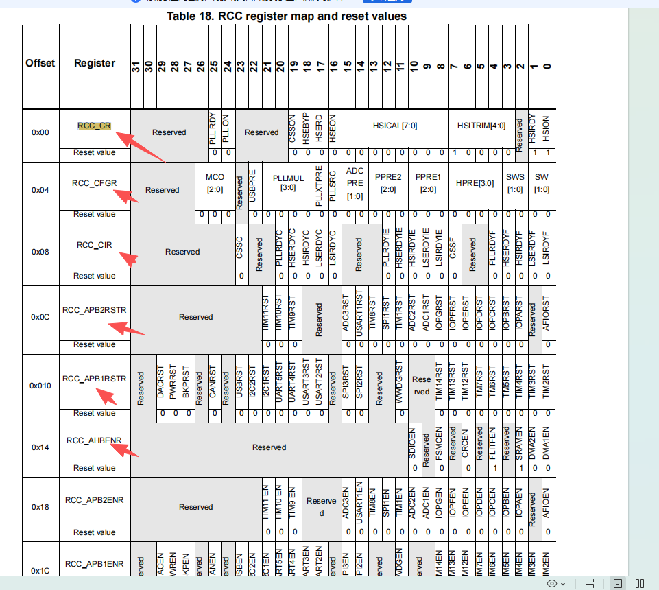 其中,Address offset:0x00表示距离首元素首地址偏移量为0x00。Reset Value为复位上电后的默认值。
