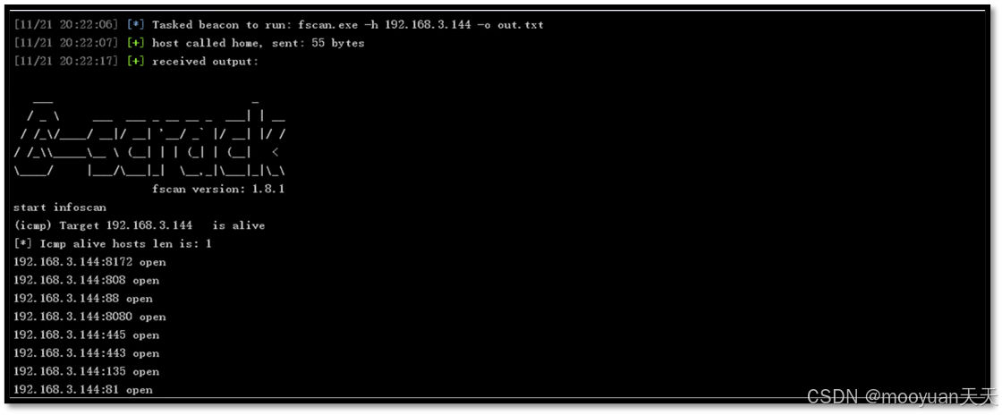 fscan 扫描结果展示了对192.168.59.143的端口、系统信息及漏洞探测情况,核心信息可以拆解为: