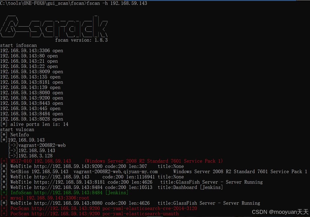 使用fscan -h 192.168.59.143进行扫描,如下所示发现ms17-010漏洞,数据库3306端口,es的9200对应的cve-201403120漏洞,8484对应的Jenkins服务等。