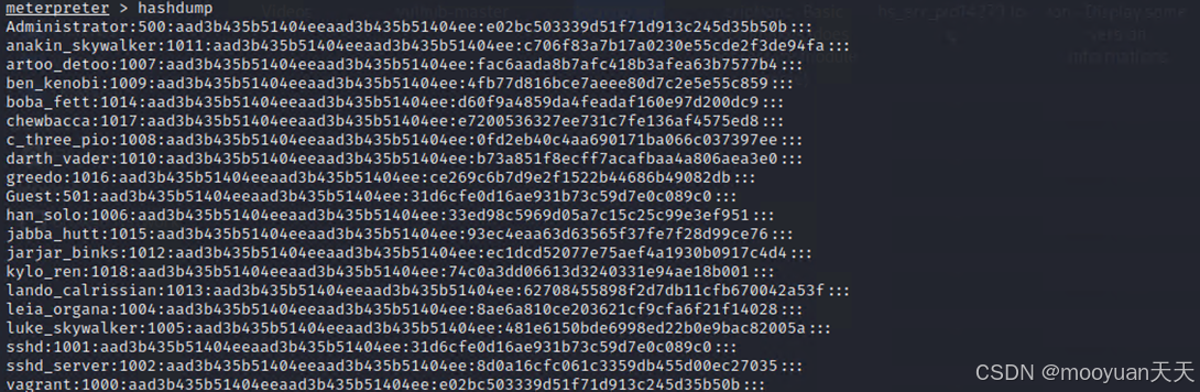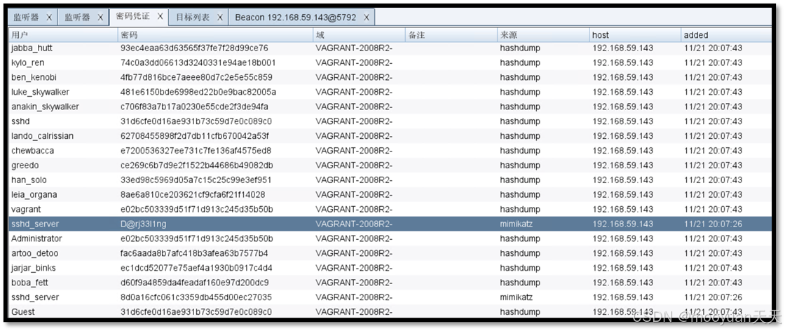 执行抓取密码,抓取hash命令,如下所示在密码凭证可以看到渗透成功。
