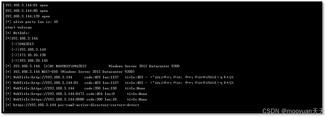 如下所示,分析获知192.168.3.144同样有永恒之蓝(ms17-010漏洞),192.168.3.144 MS17-010 (Windows Server 2012 Datacenter 9200),同时可以获知192.168.3.144的另一个ip地址为172.16.10.128。