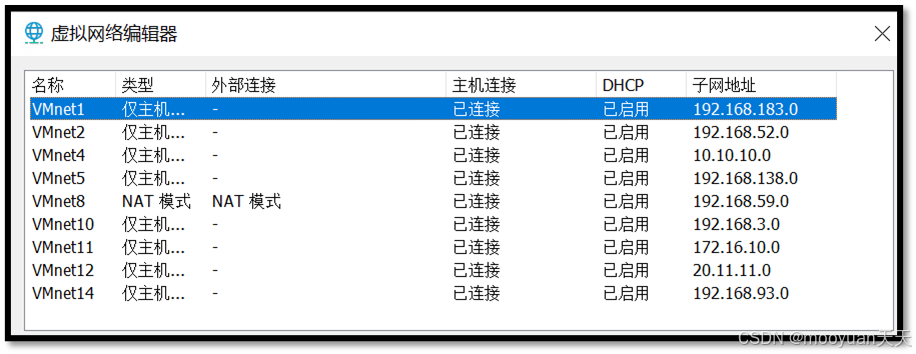 编辑虚拟网络编辑器,点击vmware-编辑-虚拟网络编辑器,进入到配置vmnet网卡的界面,如下所示。