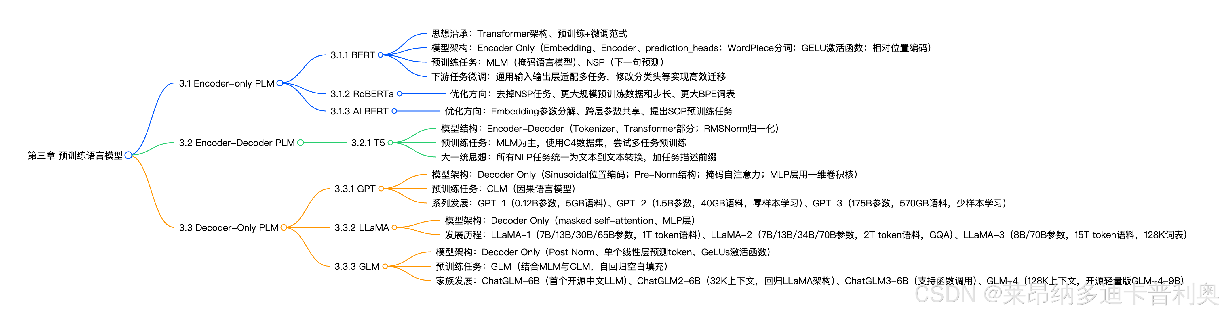 本章围绕Transformer架构衍生的三大主流PLM类型(Encoder-Only、Encoder-Decoder、Decoder-Only)展开,系统讲解各类型代表模型的架构设计、预训练任务、优化方向及发展历程,揭示现代大语言模型(LLM)的技术根基。
