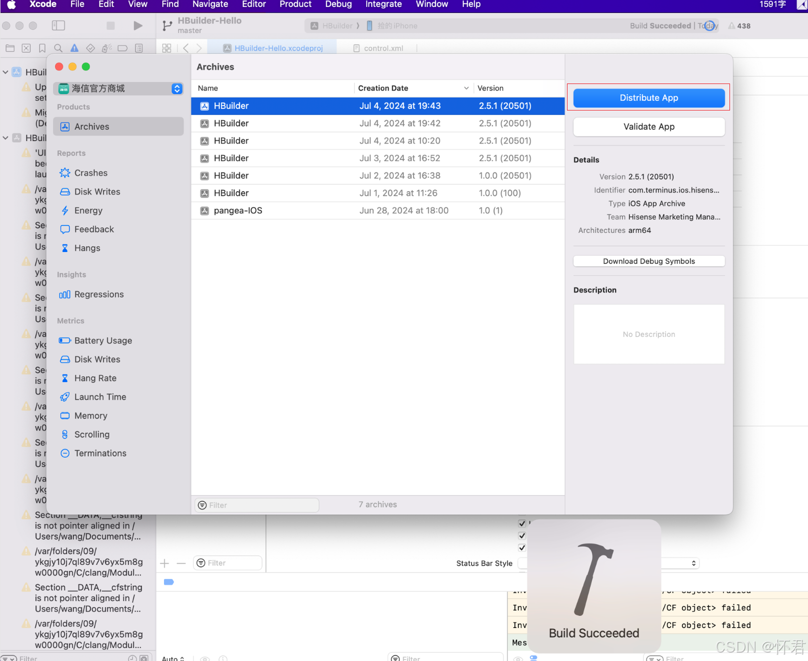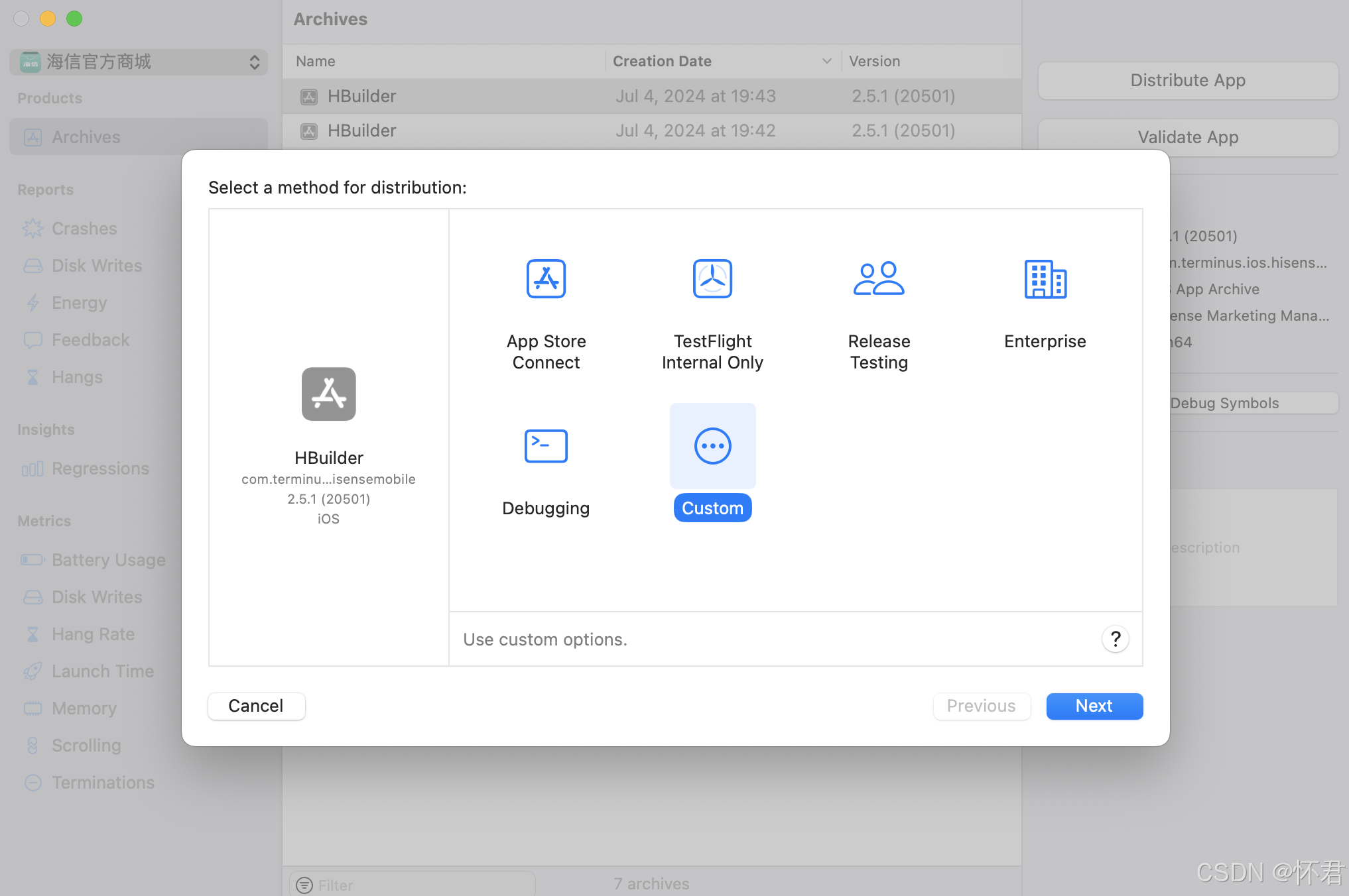 - 点击Distribute App,选择Custom,选择对应的测试包或正式包,next下一步,选择对应的发布证书和描述文件,export导出ipa包,使用Transporter工具上传ipa包。