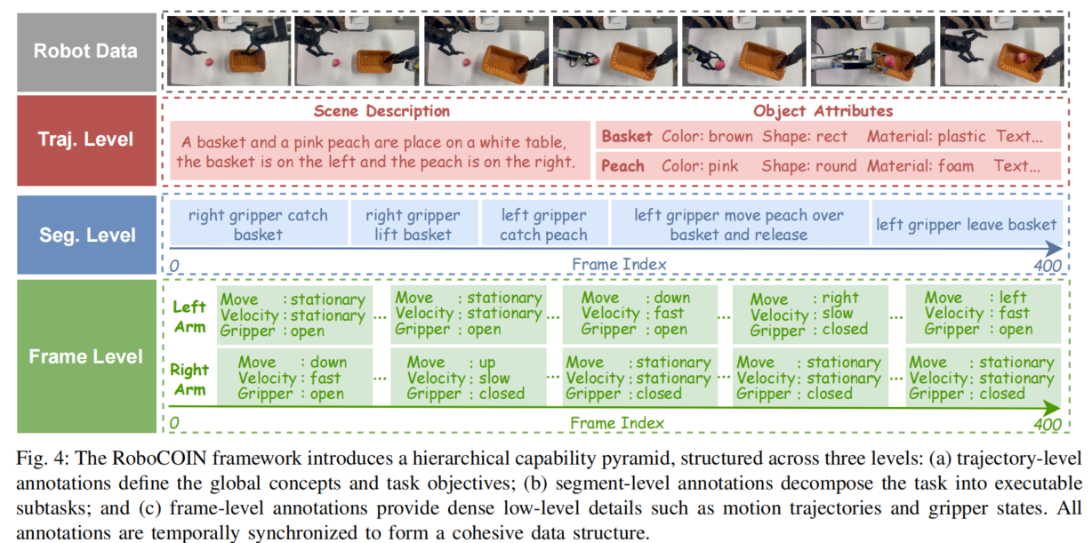 同时,RoboCOIN引入了多层级注释的分层能力金字塔,实现了从高层次概念到低层次控制的结构化学习