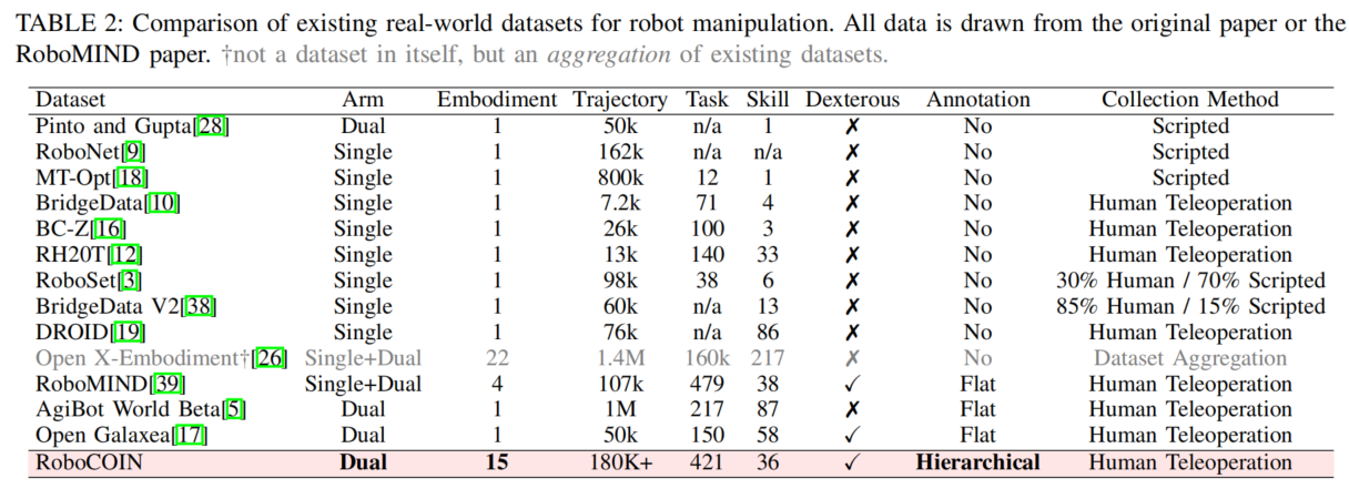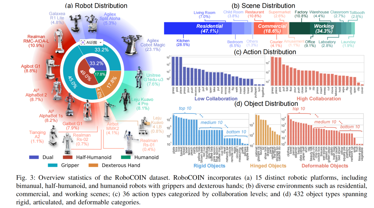 RoboCOIN数据集为双手操作提供了一个多实施例基准,集成了15个机器人平台、180K+演示、421个任务和16个场景。