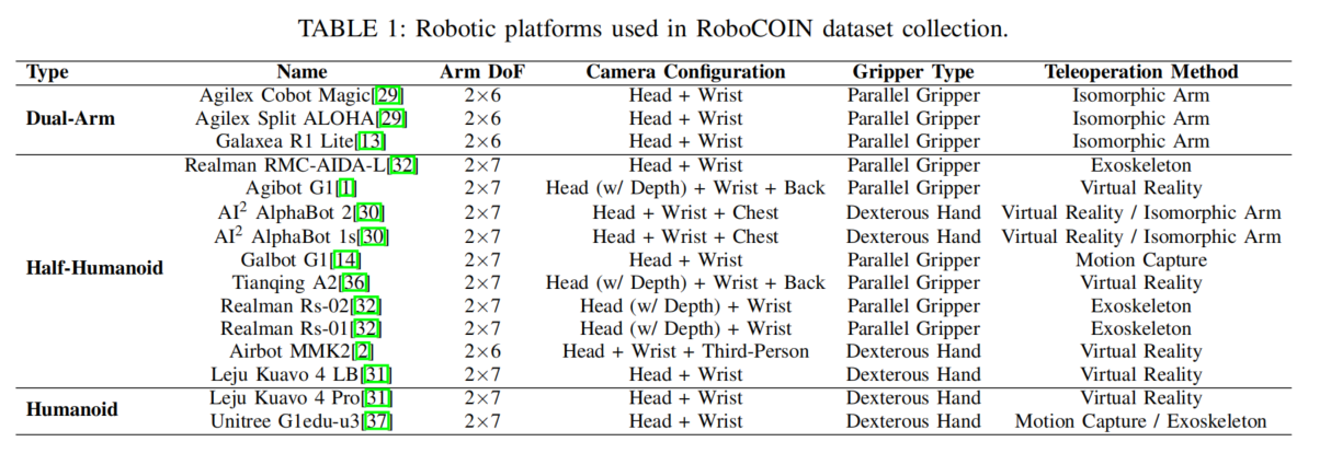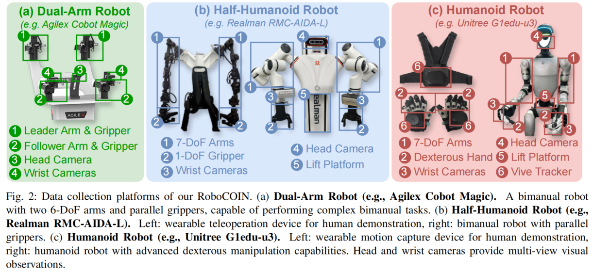 RoboCOIN框架整合了15种不同类型的机器人平台,实现全方位数据采集,涵盖双臂协作机器人、半人形机器人和全人形机器人三种配置。下图展示了三种典型平台:双臂协作机器人(如Agilex Cobot Magic)、半人形机器人(如Realman RMC- AIDA -L)和全人形机器人(如Unitree G1edu-u3)。该框架采用远程操控技术确保数据采集质量。机器人平台的完整列表详见表1。