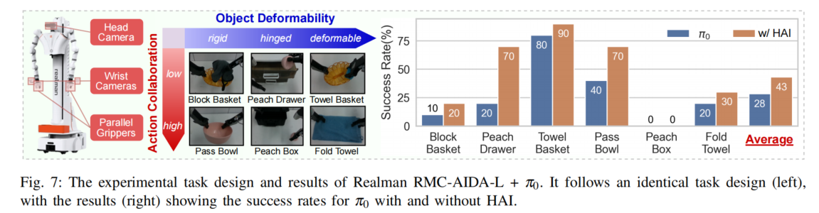 在 Realman 与 Unitree 真机平台上,对 π0、GR00T-N1.5 等先进视觉语言动作(VLA)模型的实验表明: