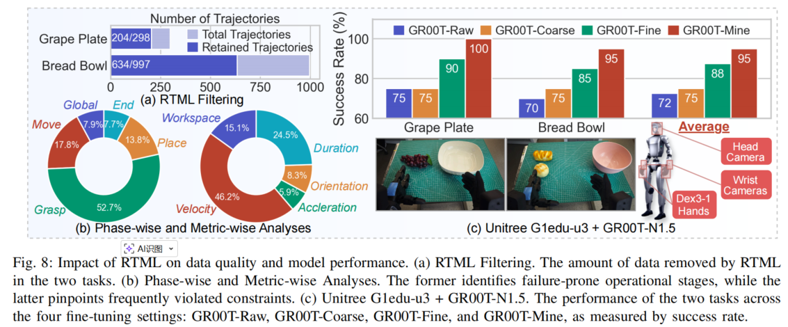 - 使用 RTML 过滤后的高质量数据训练,GR00T-Mine模型平均成功率提升 23% ,验证了"质量优于数量 "的数据范式