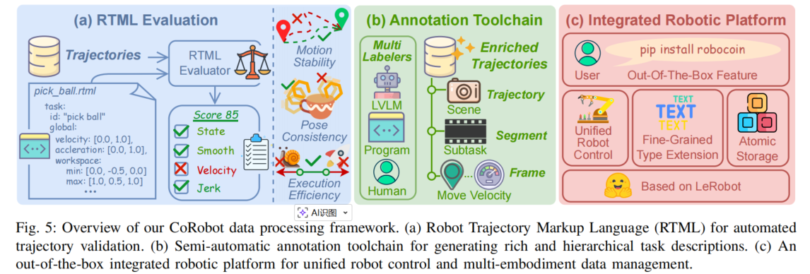 开发了CoRobot集成数据处理框架,包含机器人轨迹标记语言(RTML)实现自动化轨迹质量评估、半自动注释工具链,以及支持统一多体控制与数据管理的即用型机器人平台