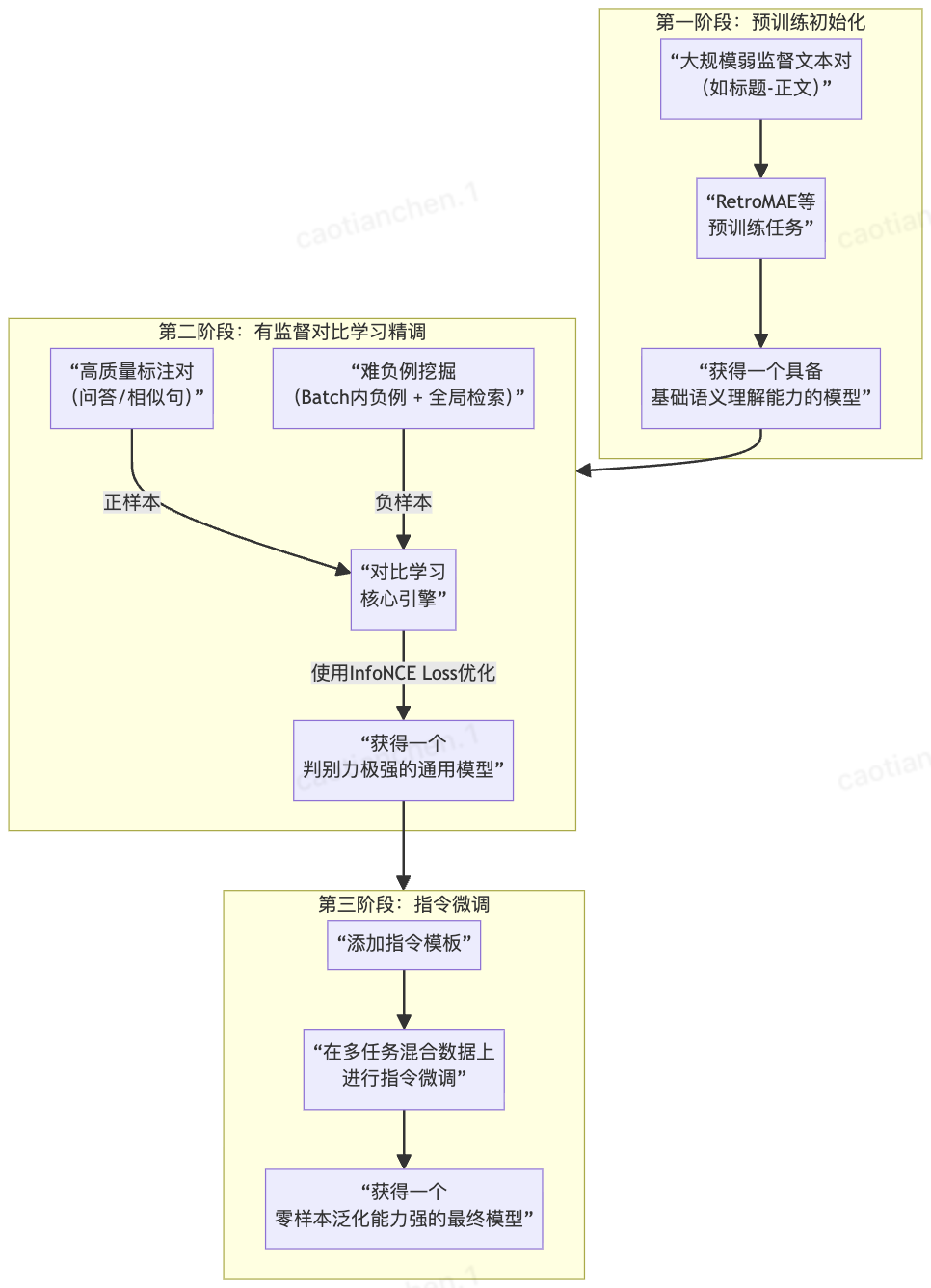 - 数据 :使用大规模弱监督文本对,例如从互联网爬取的(网页标题,正文)、(问题,相关段落)、(锚文本,链接页面)等。这些数据虽然 noisy,但数量庞大,蕴含丰富的世界知识。