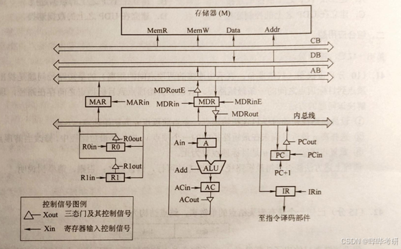 Xout:寄存器 X 输出到内总线Xin:内总线数据打入寄存器 XMDRinE:从外部数据总线 DB(主存)加载 MDRMDRoutE:MDR 输出到 DB 总线(写主存)MemR/MemW:主存读/写使能