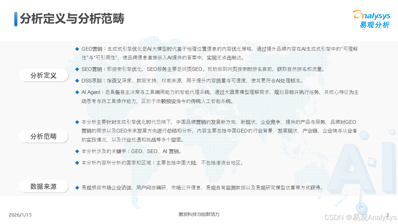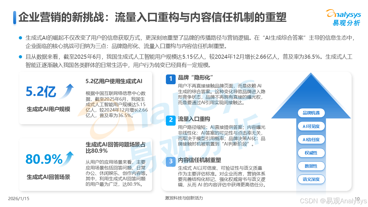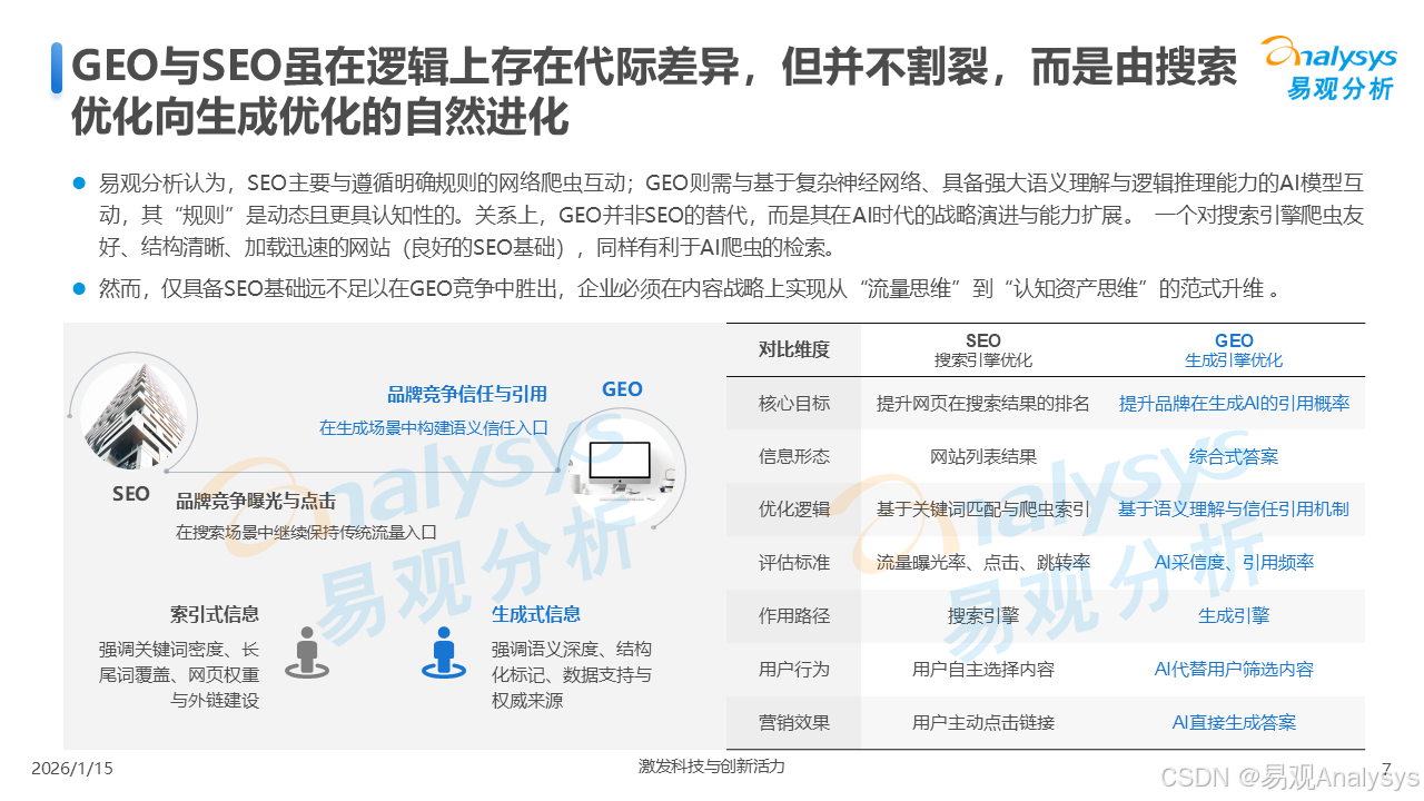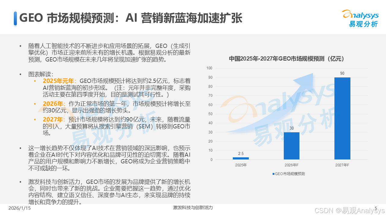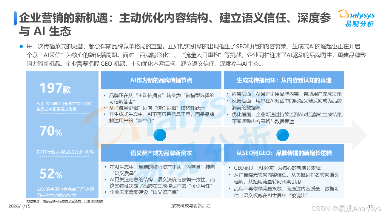 易观分析:【AI营销变革已至,GEO元年正式开启】易观分析报告揭示:GEO市场爆发在即,品牌营销正从"流量争夺"转向"语义质量"竞争。面对品牌隐形化、信任重塑等核心挑战,你的企业是否已抢占AI语义空间?点击了解GEO破解之道,把握90亿市场先机!