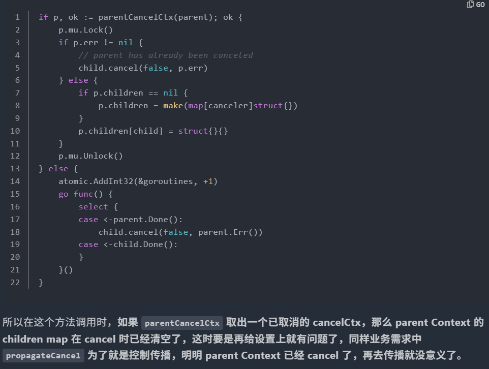 propagateCancel 会做两件可能导致 c 立即被 cancel 的事: