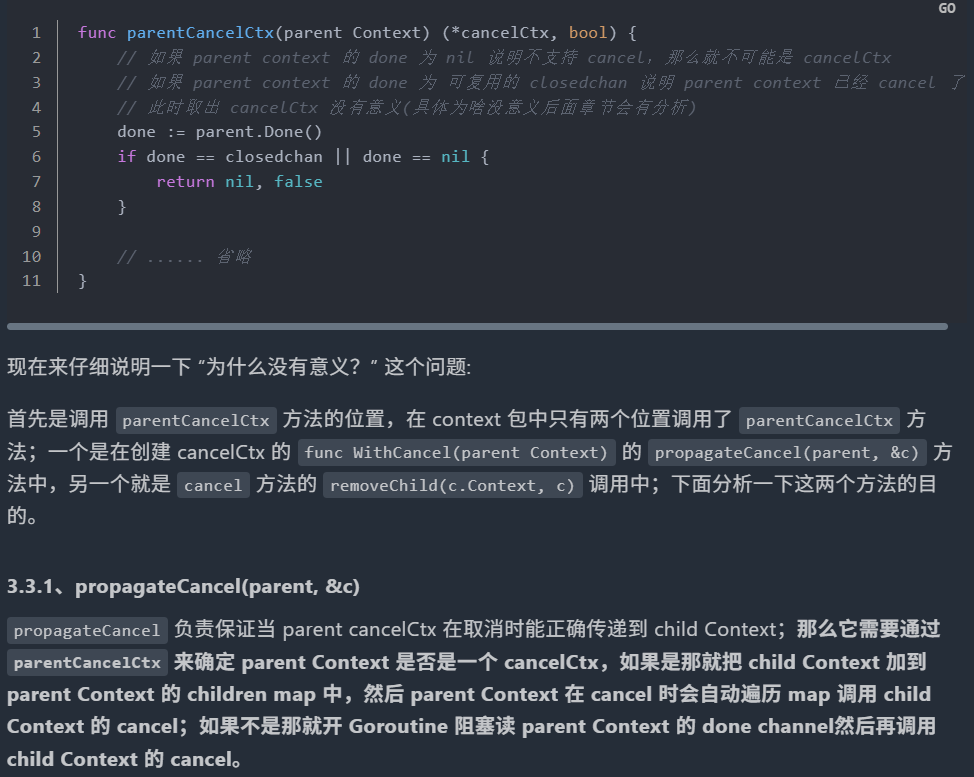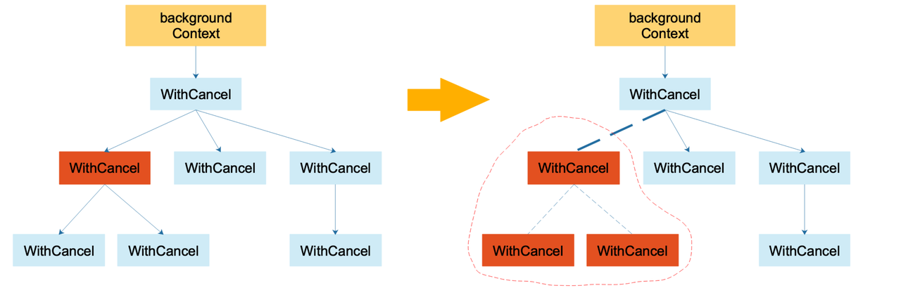 - 设置的截止时间晚于父context的截止时间,则不会创建timerCtx,会直接创建一个可取消的context,因为父context的截止时间更早,会被取消,父context被取消的时候会级联取消这个子context
