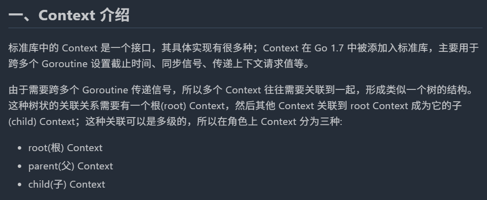 context 主要用来在 goroutine 之间传递上下文信息,比如传递请求的trace_id,以便于追踪全局唯一请求
