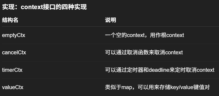 有emptyCtx、cancelCtx、timerCtx、valueCtx四种实现