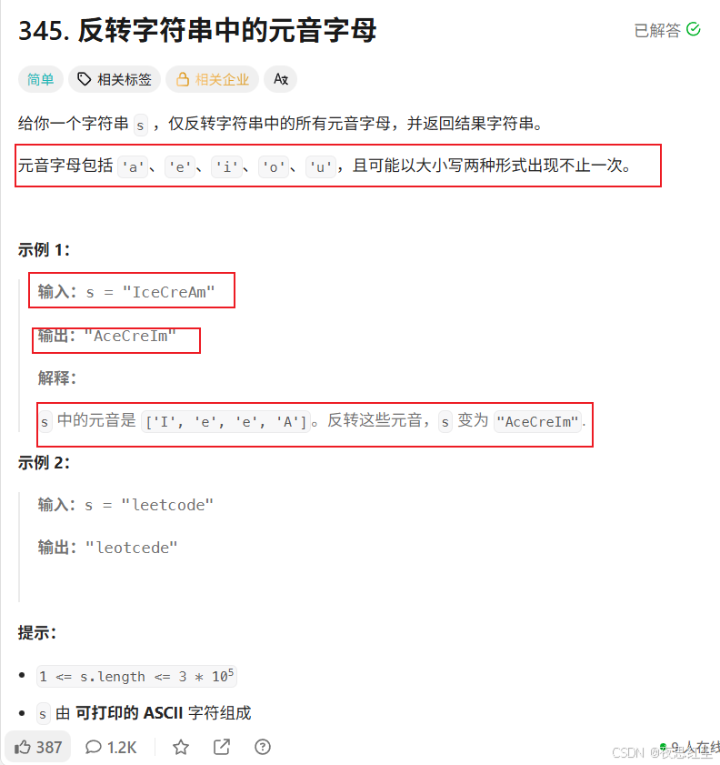 如果想直接编写的,可以直接在自己的编译器中编程序了,题目我放这里了。然后说一下我框的这几个。首先,我看的是有点懵的。仔细想一想,他的意思就是说,我们要找出一个字符串中的元音字母,然后翻转就好了。