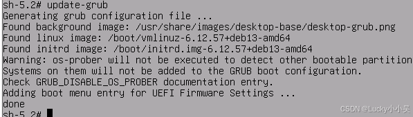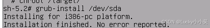 grub-install提示Installation finished. No error reported.,说明安装成功 update-grub会输出扫描到的内核信息,确保生成完整的启动配置