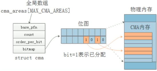 cma根据order_per_bit将连续内存分割成块,使用bitmap位图标识每一块的使用状态。