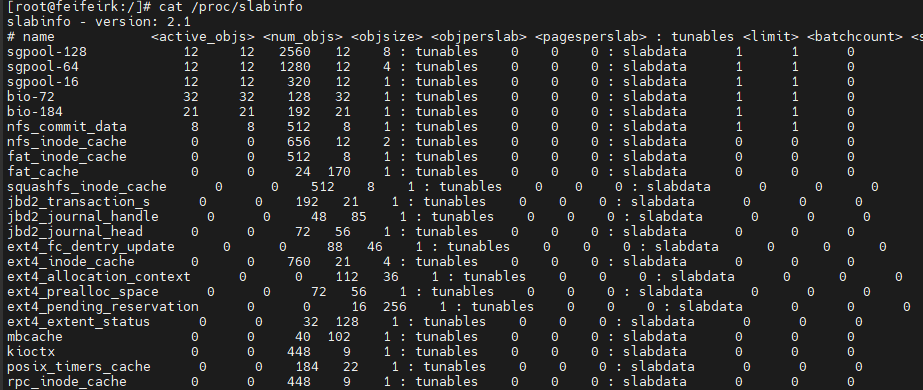 通过命令cat /proc/slabinfo可以查看slab状态信息