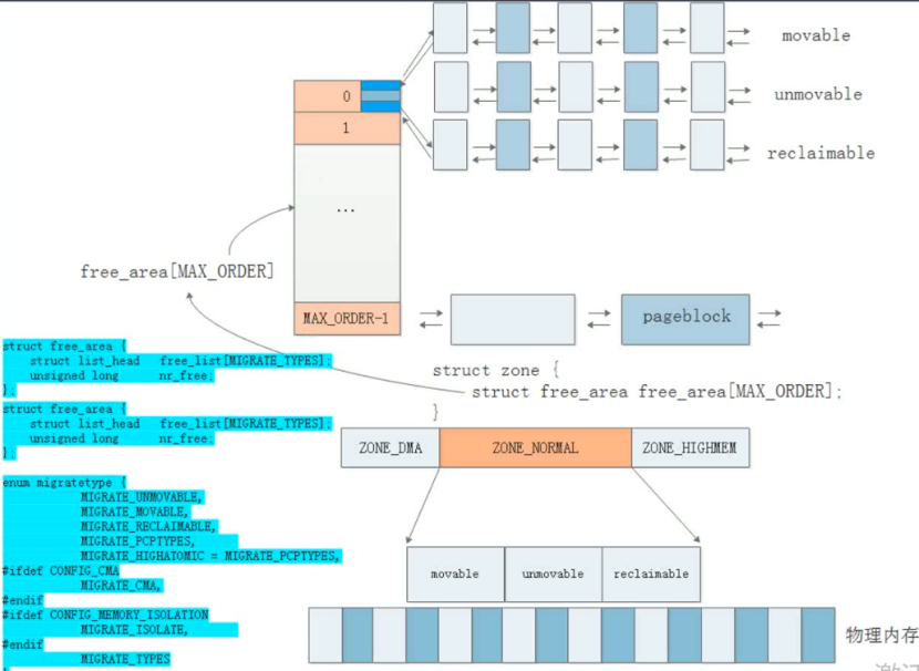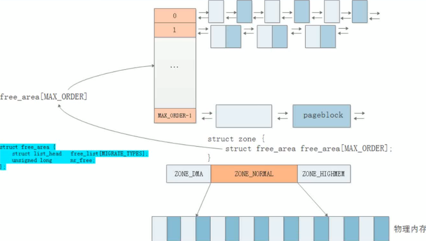 ORDER:伙伴系统的阶数(最大为MAX_ORDER),在大多数主流系统上,其默认值为 11 当 MAX_ORDER 为 11 时,意味着内核维护了从阶数 0 到阶数 10 的 11 个空闲块链表,因此能分配的最大内存块是阶数为 10 的块(即 2¹⁰ = 1024 个页面)