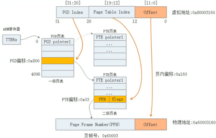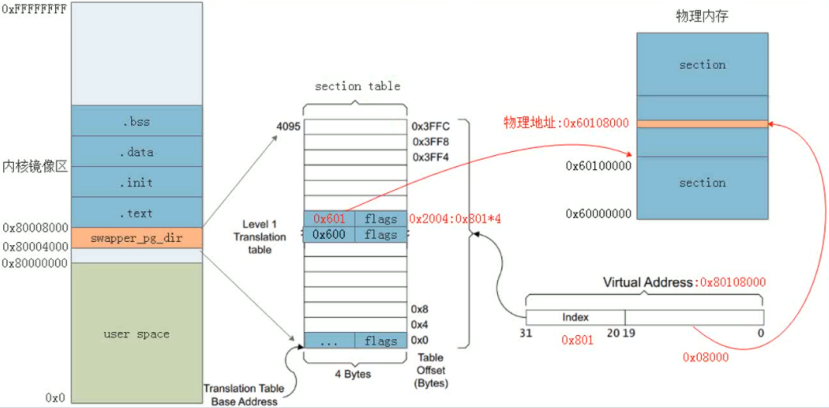 kernel运行前期采用section映射,每个section页表项对应1M字节,直接使用页表项的最高12位替代虚拟地址的高12位即可得到物理地址。