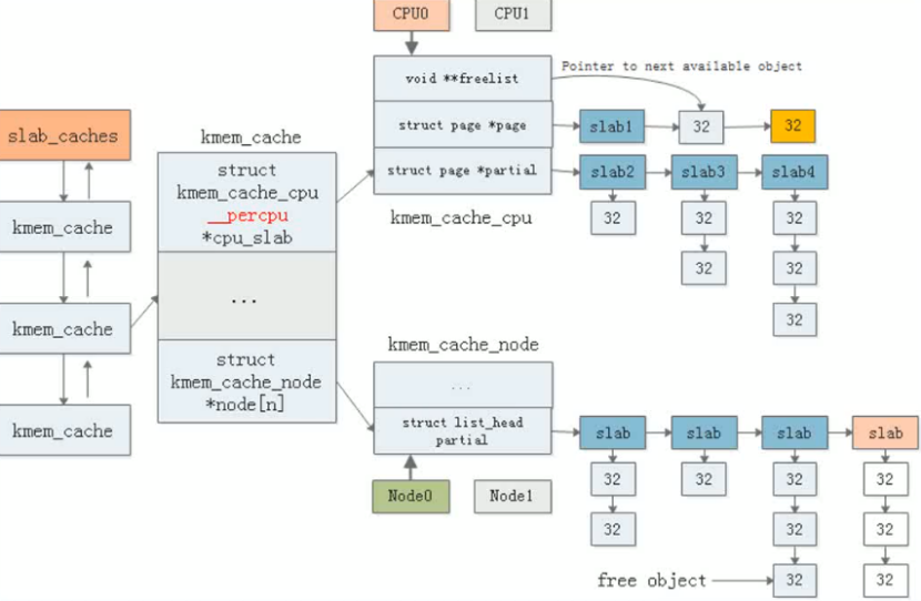 该机制基于对象管理思想,通过为频繁分配的内核对象(如进程描述符)建立缓存,减少内存碎片并提升分配效率。其核心结构包括cache和slab:每个cache存储同类对象,分配时从预留列表获取,释放后保留对象复用以减少伙伴系统的调用次数;每个slab由连续页框构成并包含多个空闲对象 。Linux系统通过定义kmem_cache对象初始化缓存,支持硬件缓存对齐优化。