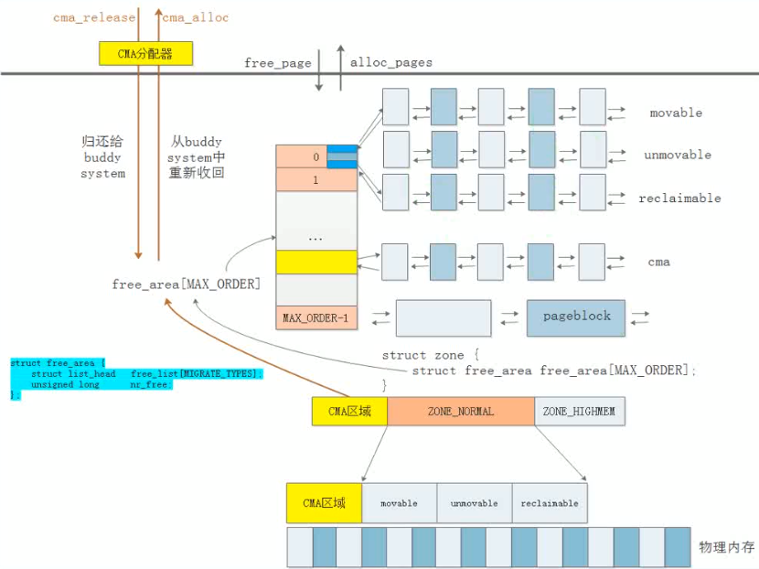 用户不使用cma空间时,cma的内存被释放到伙伴系统中使用,但只能释放到可移动的或可回收的链表中。