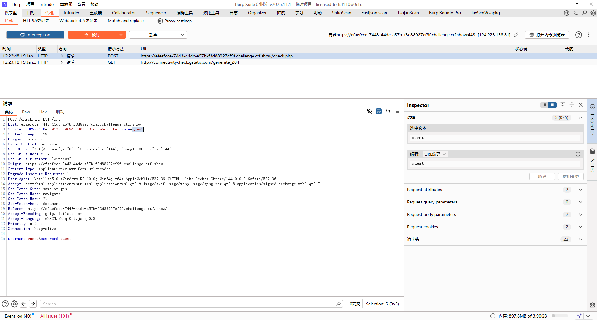 使用Burp抓包,发现Cookie中有 "role" 字段,字段值为 "guest",修改为 "admin"